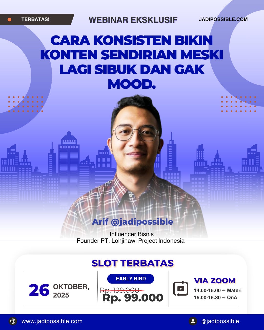 Kalau lo mau ikut, daftar langsung di sini ya 👉 jadipossible.myr.id/webinar/cara-konsisten-bikin-konten-sendirian-meski-lagi-sibuk-dan-gak-mood