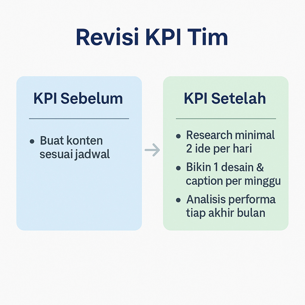 Yang dulu cuma berisi kalimat umum kayak “pastikan konten terpublish sesuai jadwal”, sekarang gue ubah jadi rinci banget. Misal, untuk Risma, gue tulis target output harian, mingguan, sampai metrik engagement-nya. Untuk Rina, gue spesifikin tanggung jawab hunting, newsletter, dan jumlah story per hari. Semua terukur, gak ada lagi ruang abu-abu.