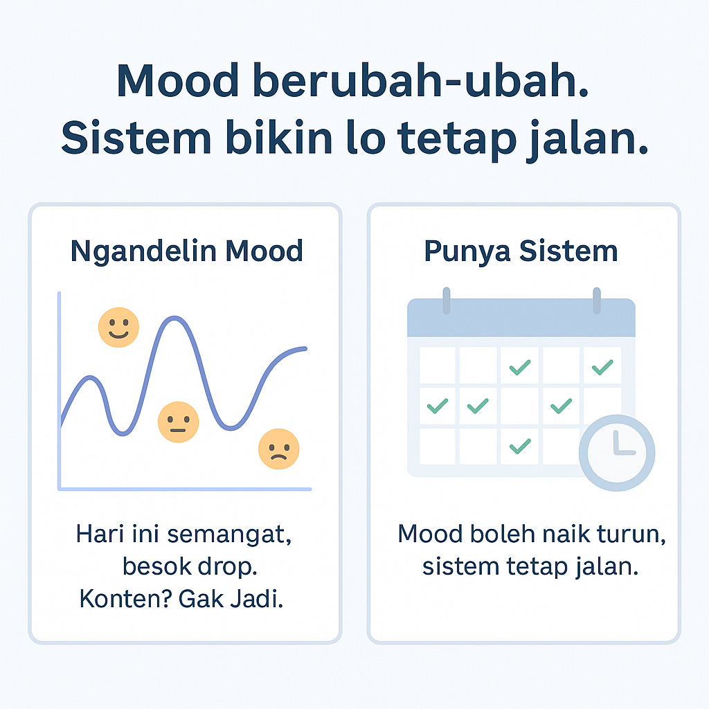 Bahkan hal sepele kayak nyatet ide di notes bisa jadi bagian sistem. Ide yang kelihatan receh hari ini, bisa lo olah jadi konten berharga besok. Bayangin kalau lo cuma ngandelin mood: begitu ide itu lewat, hilang begitu aja.
